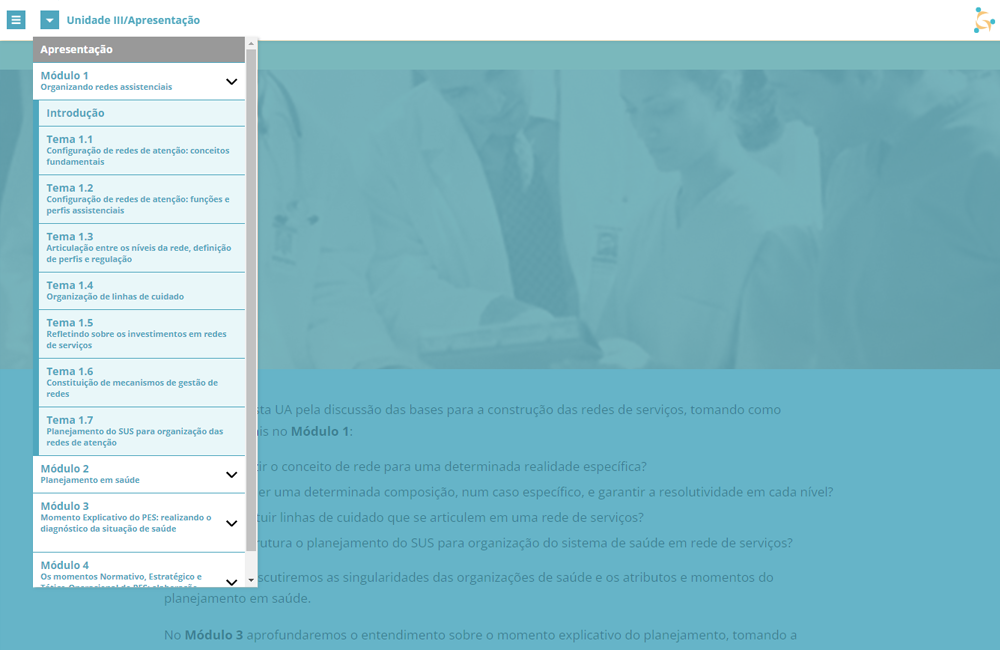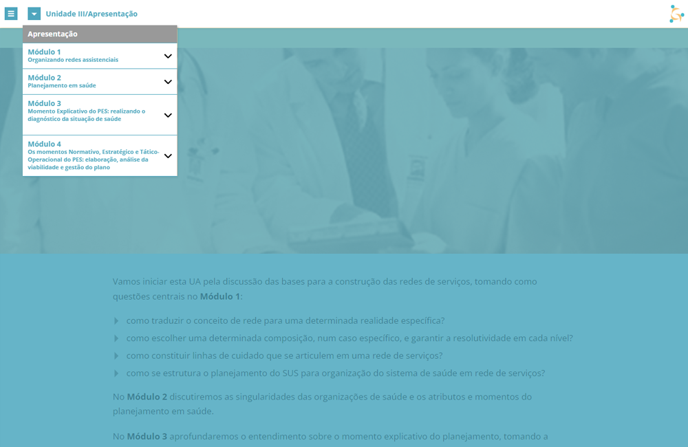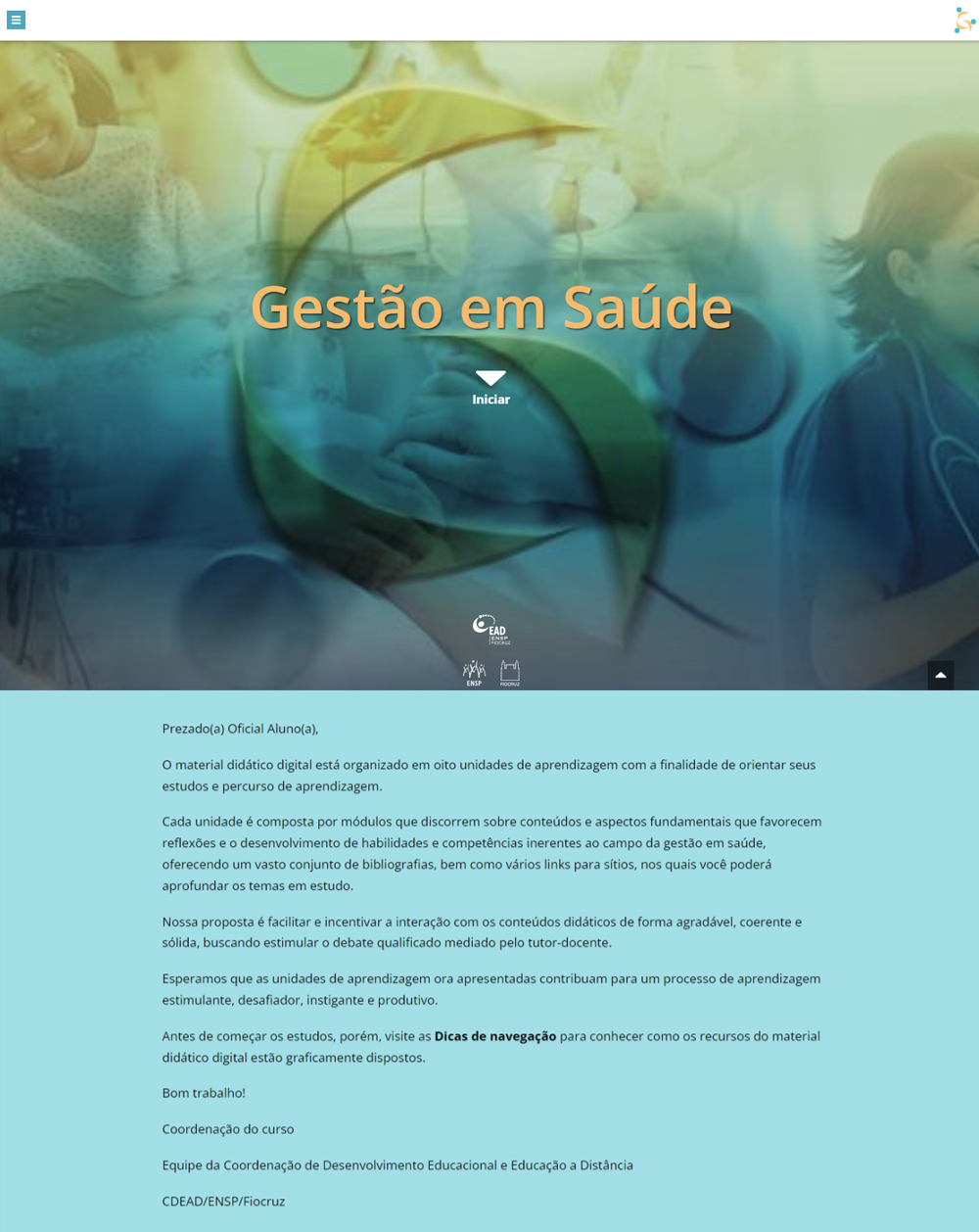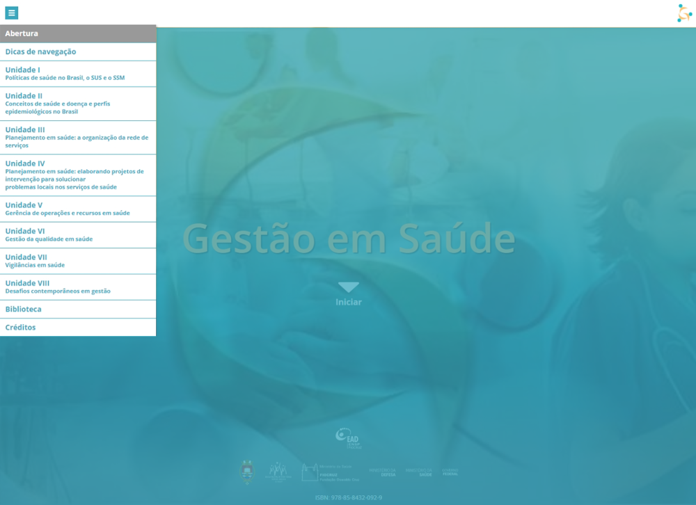 Cada unidade é composta por módulos que discorrem sobre conteúdos e aspectos fundamentais que favorecem reflexões e o desenvolvimento de habilidades e competências inerentes ao campo da gestão em saúde, oferecendo um vasto conjunto de bibliografias, bem como vários links para sítios, nos quais você poderá aprofundar os temas em estudo.