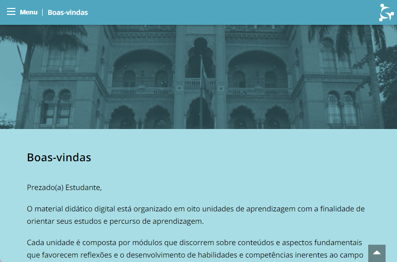 A barra superior, presente em todas as páginas, sempre exibirá o menu de navegação com as opções para acesso às unidades de aprendizagem deste material didático digital.