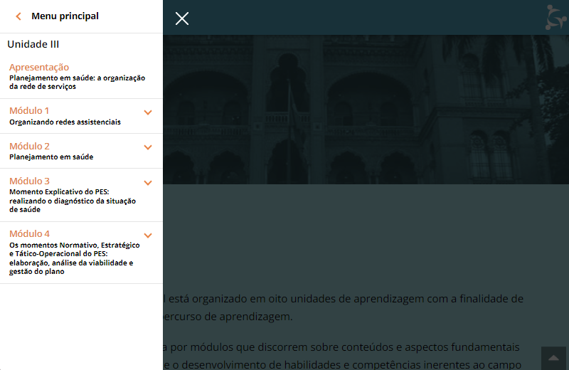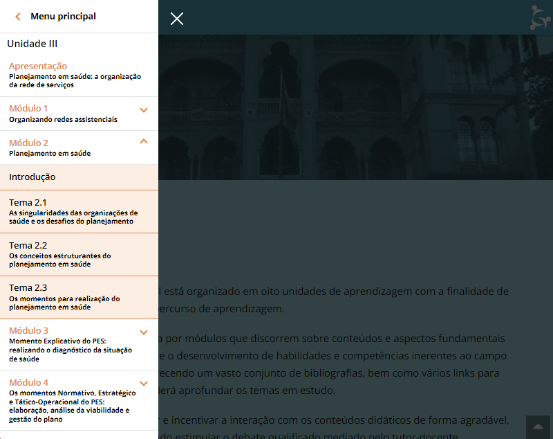 O menu de navegação, acessível a partir da barra superior, se desdobra em três níveis. O primeiro mostra a lista com as unidades de aprendizagem do material didático digital. Ao clicar nelas, você acessa o segundo nível, que são os módulos de cada unidade; já o terceiro nível permite acessar os temas específicos de cada módulo.