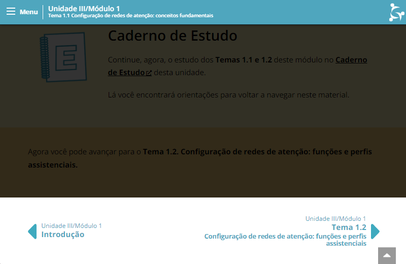 No rodapé de todas as páginas deste material didático digital, você encontrará os botões de navegação sequencial com as opções para voltar à página anterior ou navegar para o próximo tema, módulo ou unidade.