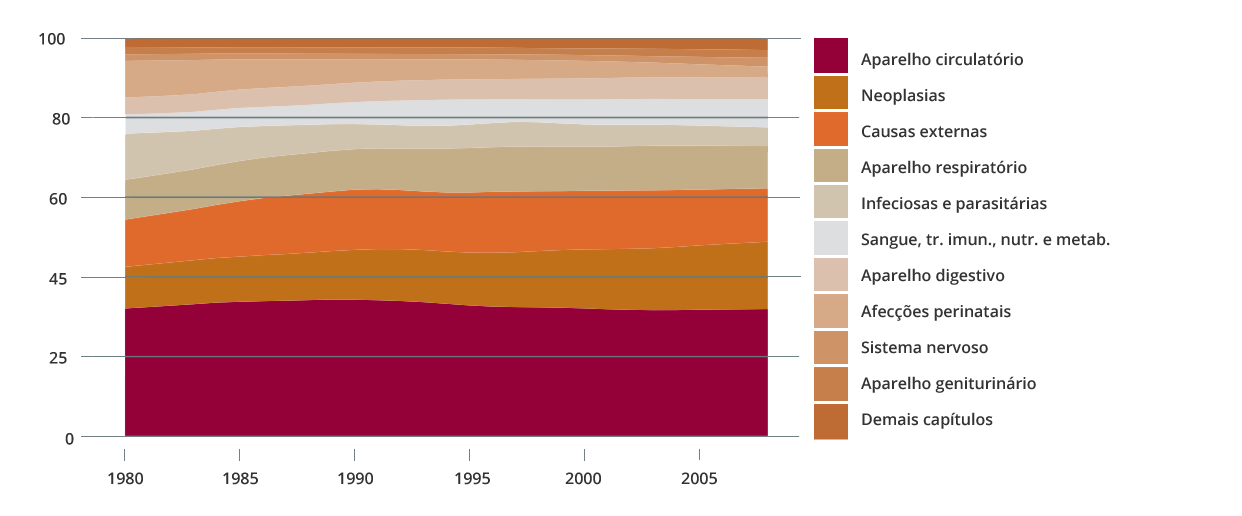 Nesse período ocorreu a transição epidemiológica nas populações das capitais brasileiras, com importantes mudanças nas principais causas de morte, como pode ser observado no Gráfico 1.