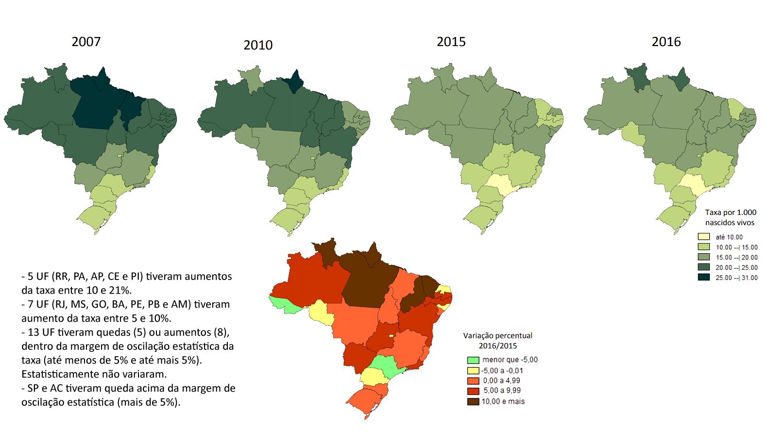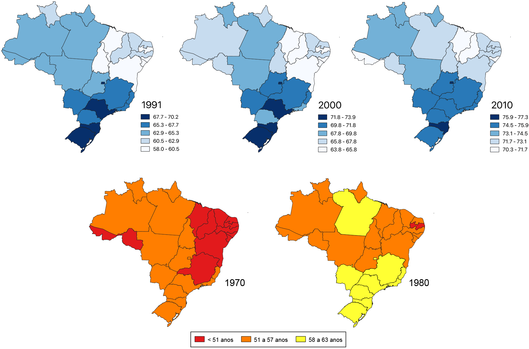 A redução da mortalidade ocorreu em todas as grandes regiões do país, como mostram os indicadores de expectativa de vida estimados por unidades federadas, mas o modelo de desenvolvimento econômico-social também consolidou as desigualdades históricas entre as unidades e regiões do país, como mostra a Figura 2, que apresenta a distribuição territorial da expectativa de vida ao nascer no Brasil, por unidade federada, em cinco anos diferentes.
