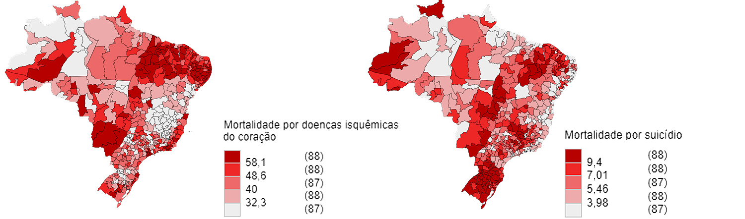 Nesse nível, além da desigualdade regional característica do modelo histórico de desenvolvimento brasileiro, pode-se observar, na Figura 3, que mostra as distribuições territoriais de alguns agravos sob a forma de mapas temáticos, que existem grandes diferenças entre os municípios dentro de cada uma das grandes regiões, refletindo as particularidades das condições de vida e seus determinantes socioambientais.