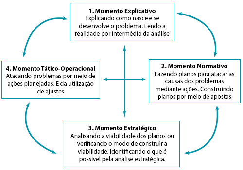 Apesar das suas especificidades, esses momentos encontram-se intimamente articulados e se complementam na prática do planejamento, em uma relação dinâmica. A todo momento revisamos nossa situação, assim como a evolução dos nossos problemas e suas explicações, a fim de revisar as ações propostas, viabilizar as intervenções e avaliar os resultados.