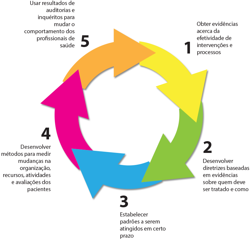 No ciclo de melhoria de qualidade (Figura 1), a apropriação de evidências acerca dos cuidados a determinado problema de saúde, para uma população com características clínicas definidas, que maximizam as probabilidades de ocorrência dos melhores desfechos, é inquestionavelmente desejável.
