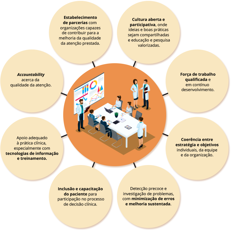 O processo de melhoria de qualidade, por sua vez, é assumido como uma responsabilidade da organização de saúde como um todo e, em um nível mais amplo, do sistema de saúde como um todo, devendo envolver gestores e corpo clínico multiprofissional, com crescente valorização da ideia de prestação de contas (accountability) à sociedade.