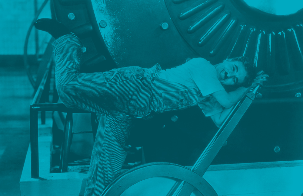 O filme Tempos Modernos, de Charles Chaplin (1936), mostra com maestria o frenético ritmo da sociedade de produção em massa, então, vigente.