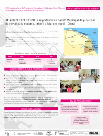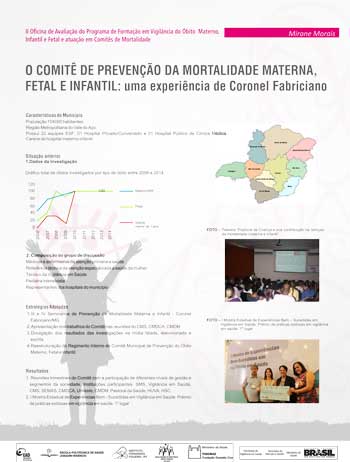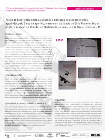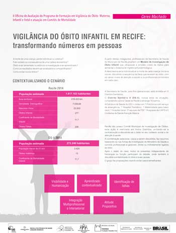 A 1ª Oficina de Avaliação do Programa de Formação em Vigilância do Óbito Materno, Infantil e Fetal e de Atuação em Comitês de Mortalidade ocorreu em abril de 2014 e teve como foco a discussão do material didático e do processo de ensino e aprendizagem. Ela contribuiu, efetivamente, para revisão e ajustes dos conteúdos e das atividades, tendo em vista as novas edições de cursos que seriam ofertadas em seguida.