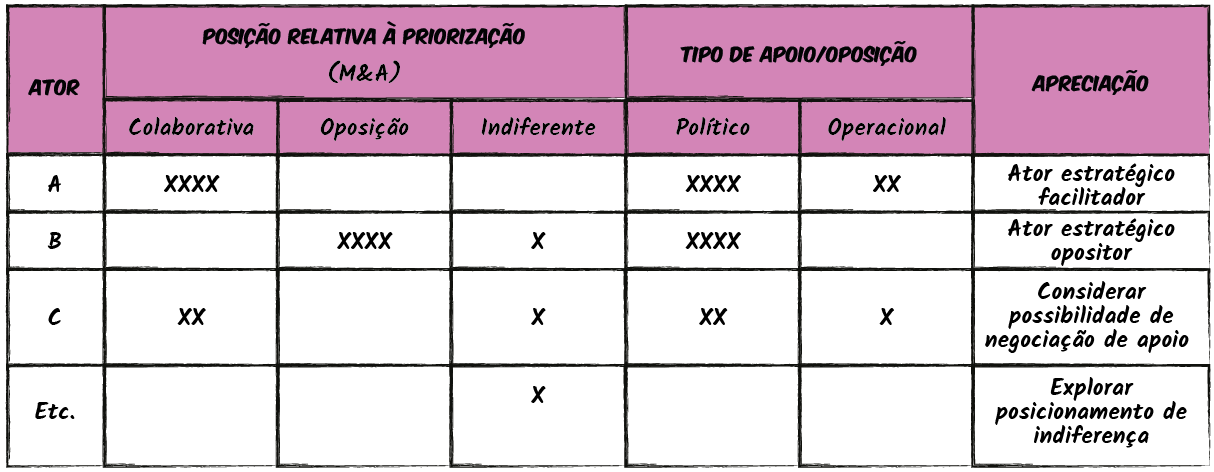 Deve incluir a caracterização do posicionamento dos atores em relação aos problemas e às intervenções propostas, bem como de seus papéis e interesses no monitoramento e na avaliação.
