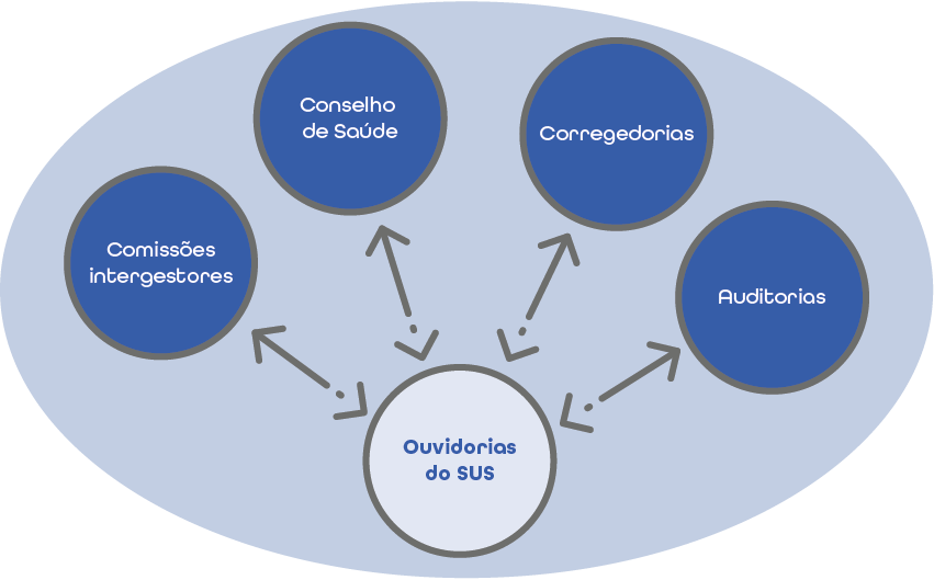 Nos mecanismos de controle social das instâncias referidas, as ouvidorias também estão presentes, participando e colaborando. Isso acontece, por exemplo, pela escuta permanente dos cidadãos e a condução de suas manifestações para os espaços de gestão e pela gestão ampliada e compartilhada (participativa), como propõem as comissões intergestores.